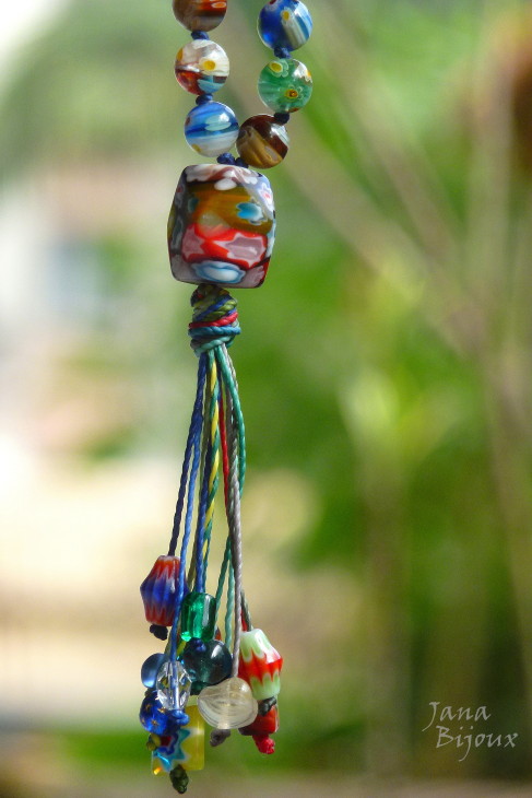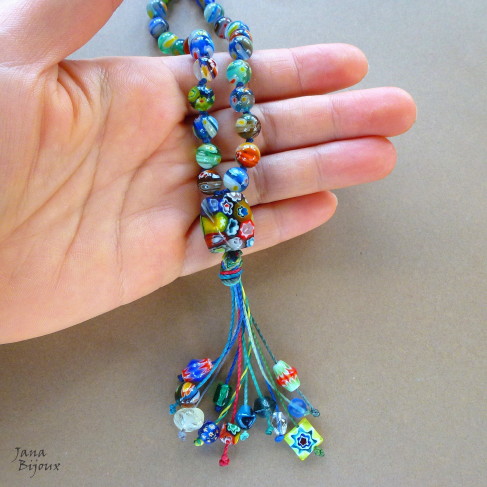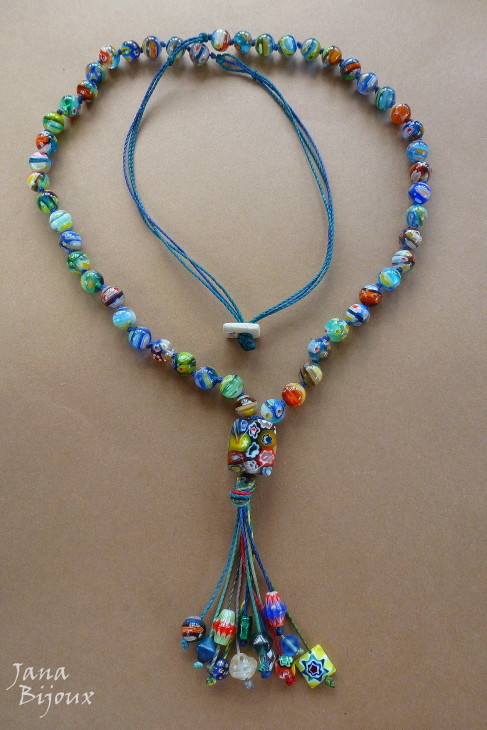 DLOUHÝ NÁHRDELNÍK Z MILLEFIORI, RUČNĚ DĚLANÉHO SKLA, UZLY MEZI KORÁLKAMI, BEZ JAKÉHOKOLIV KOVU, UPRAVITELNÁ DÉLKA.