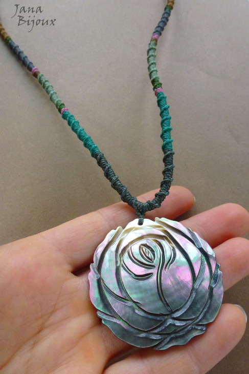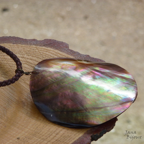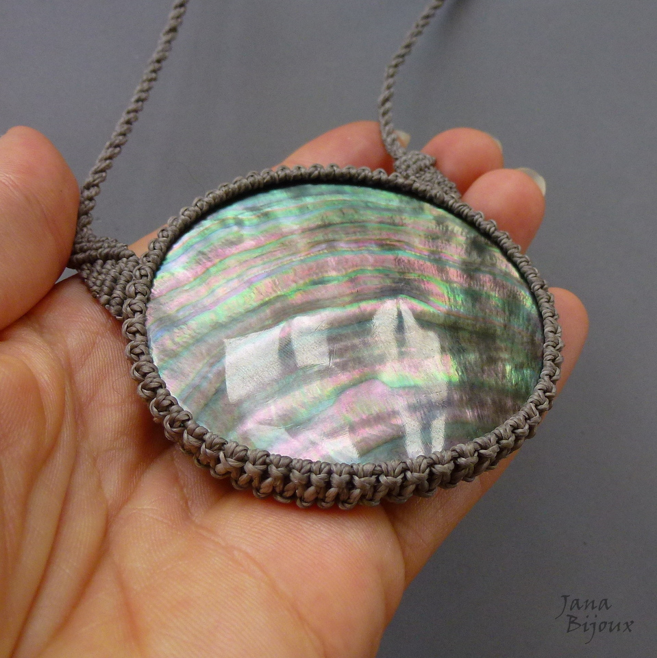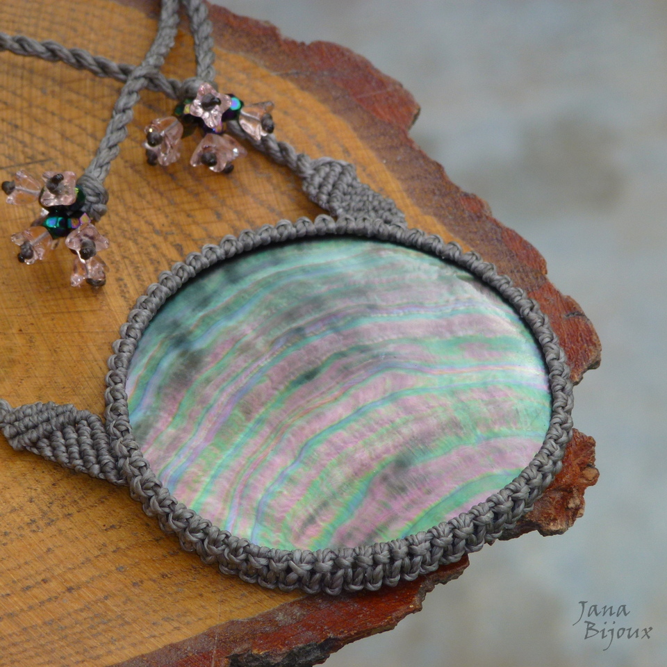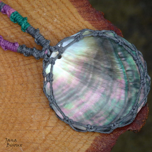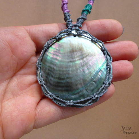 Margaritifera mede com macramé 6,4 cm. Infelizmente é difícil fotografa-la, na realidade é mais , muito mais bonita, com alto brilho e super furta-cor.