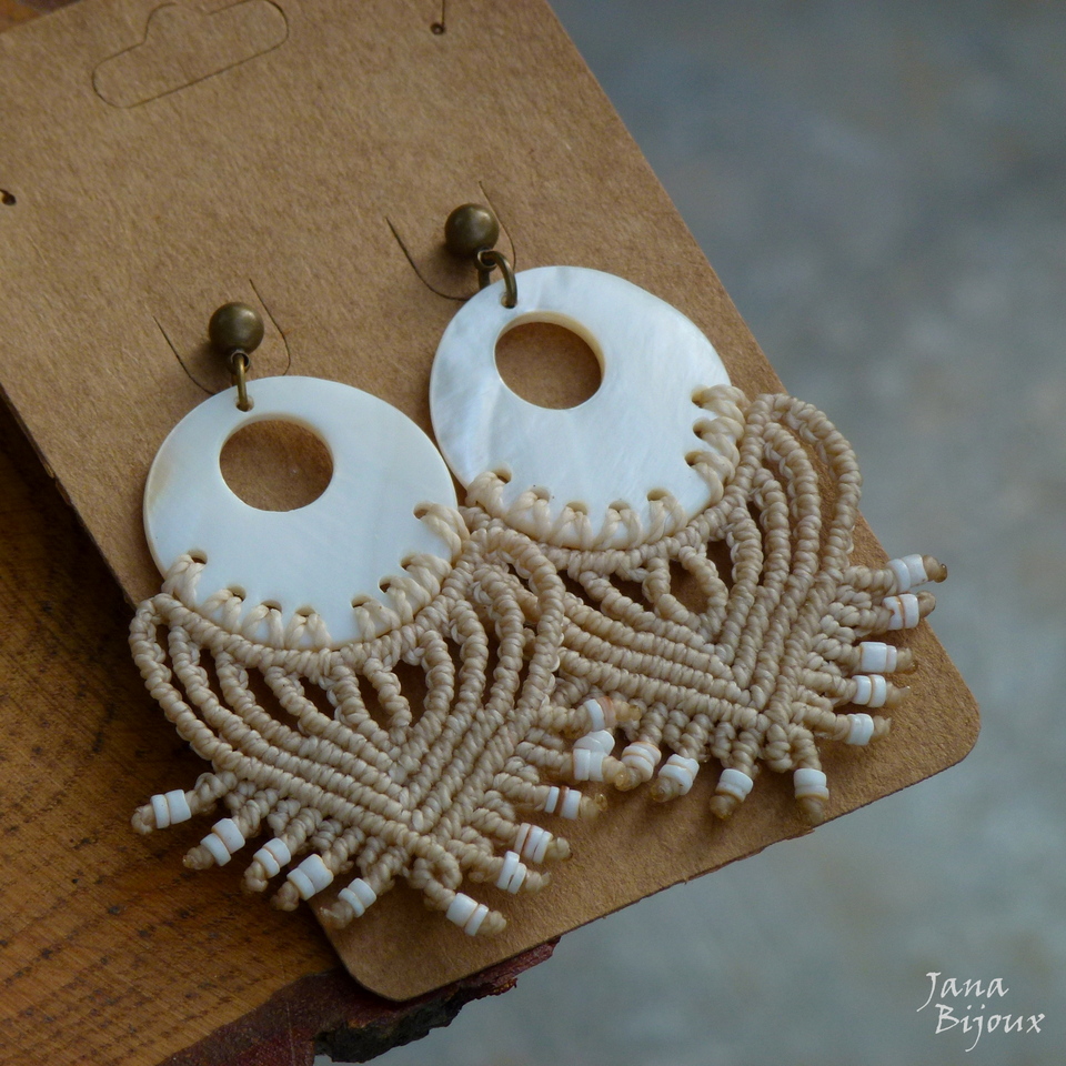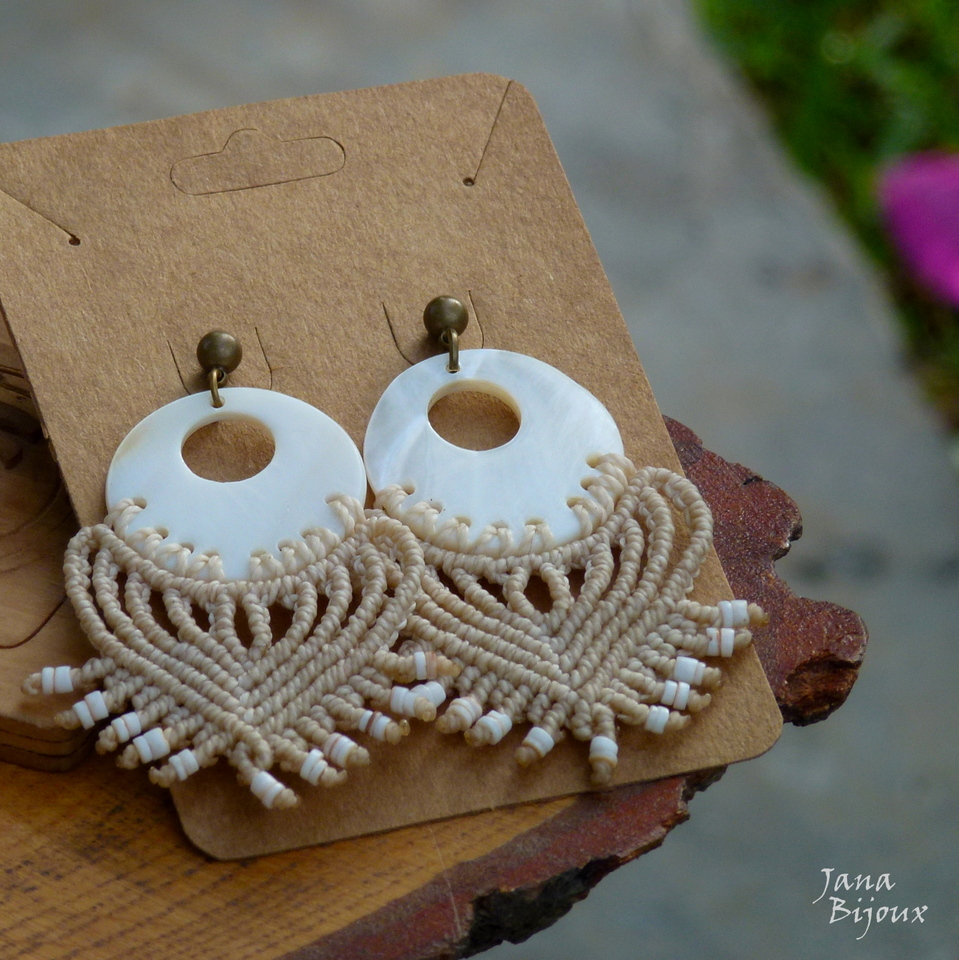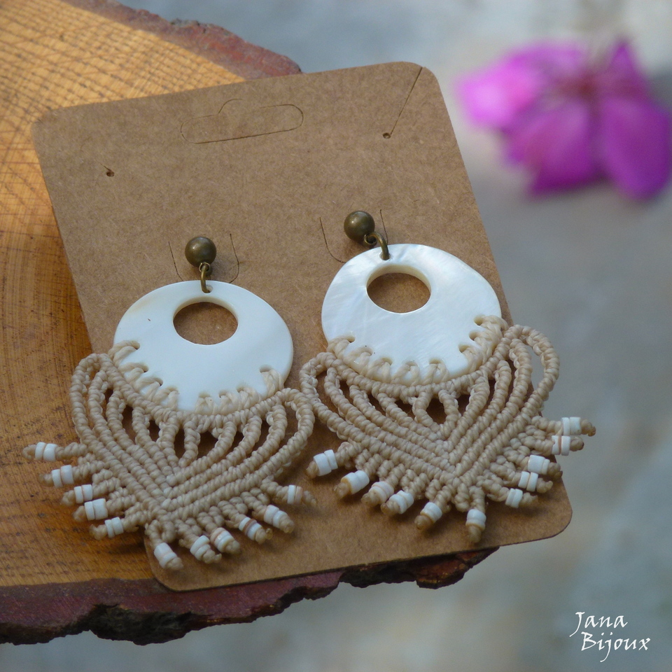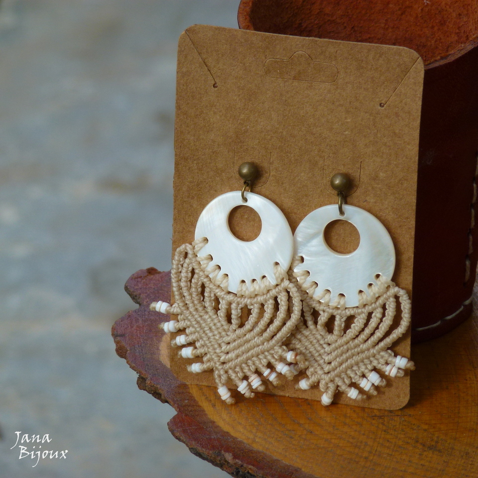 Brincos de macramé, comprimento 7,2 cm de altura e 3,5 cm de largura, super leves, com anzol sem niquel, miçangas e cristal. R$ 33,00
