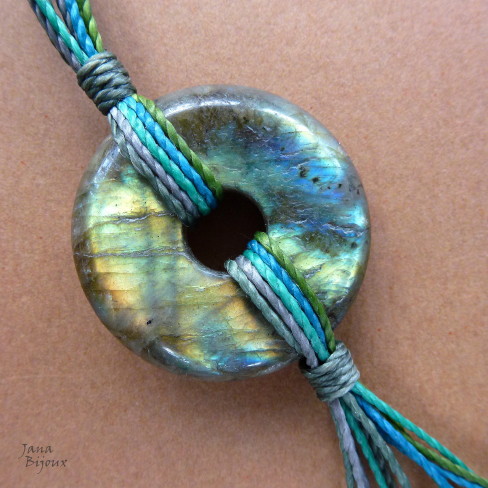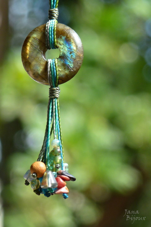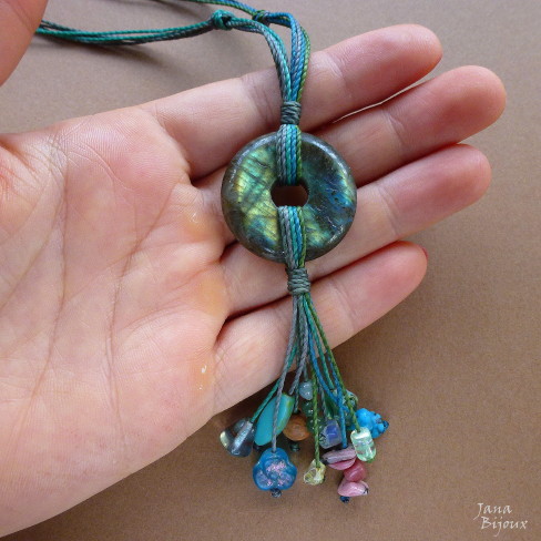 Colar delicado com labradorite, fios em tons verdes e azuis, diversas pedras como selenita, rodonita, amazonita e vidro. Acabamento em cerâmica com comprimento ajustável R$ 33,00. A pedra tem 3 cm.