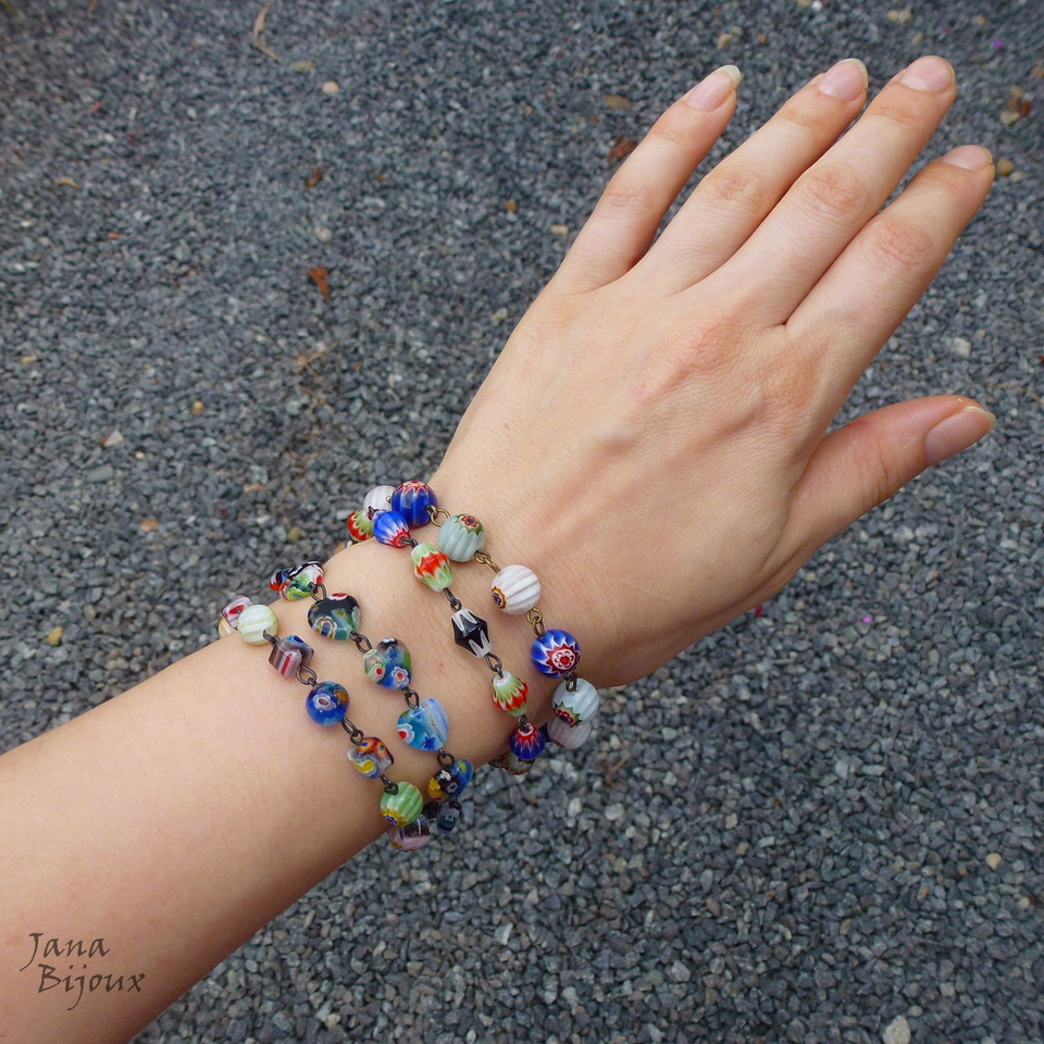 n141 07/03/2016VENDIDOS ( Prodáno)italiano, MILLEFIORI, pulseira de vidroJana Bijoux Pulseira de millefiori, componentes ouro velho, com opção de vários comprimentos. 19,5 cm, 21,5 cm e 23,5 cm. R$ 28,00. Possível em outro metal, por mesmo preço : banhado à prata, dourado ou preto.