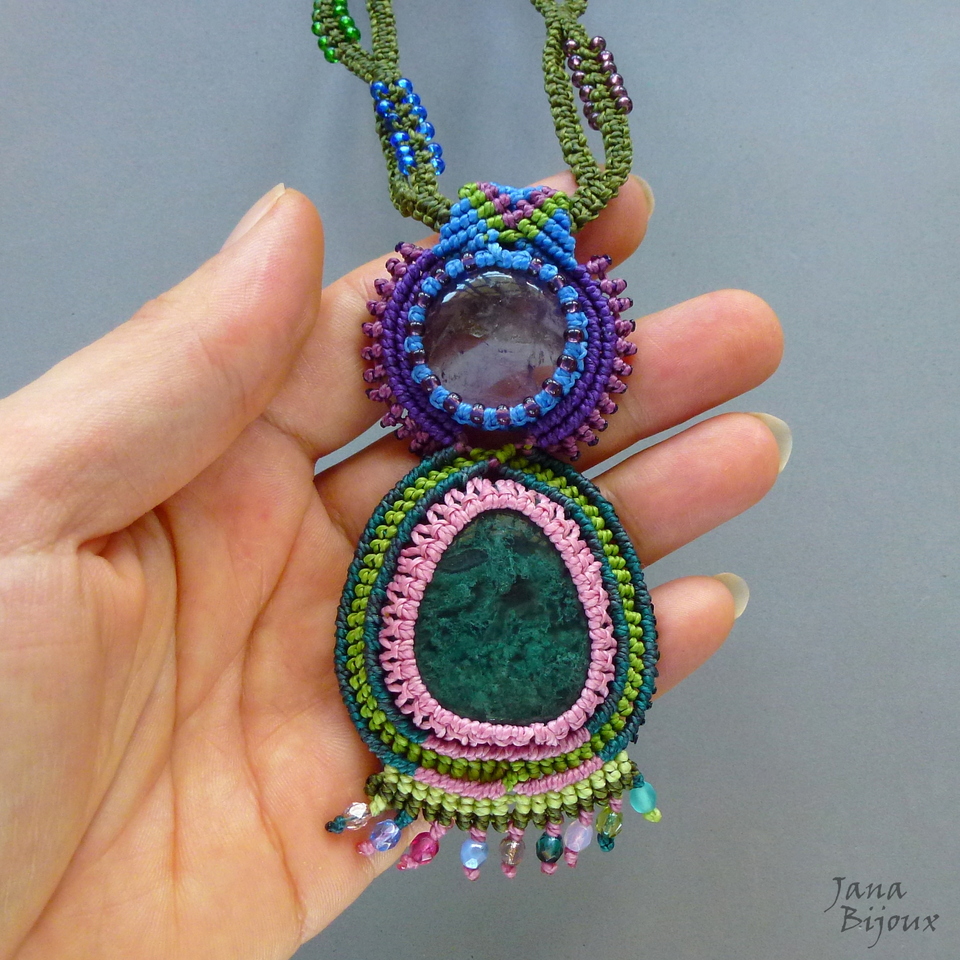 Pingente mede 10,5 cm por 5 cm. As pedras seguram só com nós, sem cola e sem furo. A pedra maior, agata musgo tem linda cor de verde petróleo e a menor, ametista é quase transparente. Pingente de franja com cristais coloridos, importados.