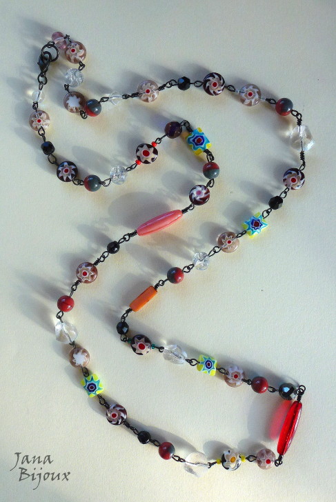 DLOUHÝ NÁHRDELNÍK Z TOČENÉHO MĚDĚNÉHO DRÁTU,SKLA, VOSK. NITÍ A KERAMIKY, DÉLKA UPRAVITELNÁ.