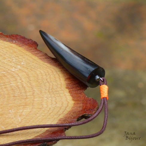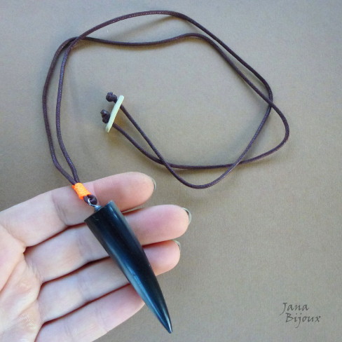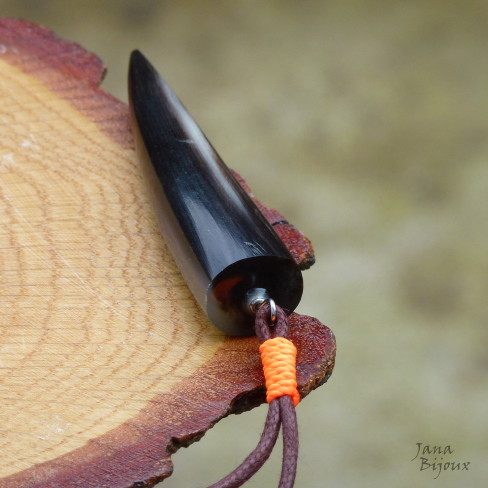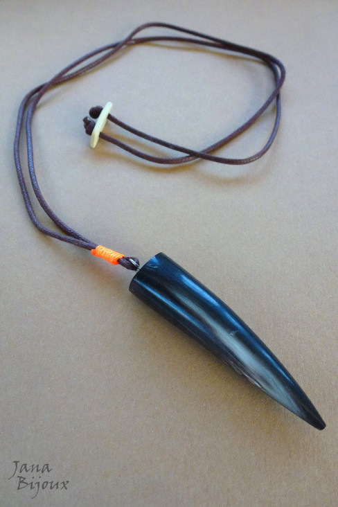 Uma garra de chifre unissex, minimalístico, com um pingo de cor laranja neon em forma de nó artesanal em cima de pingente – para toque moderno. O pingente tem 6,5 cm, é redondo e maciço e tem arame de inox com fio importado marrom que tem 72 cm. O acabamento em cerâmica com iniciais JB, nós com tratamento para não desfiar. R$ 25,00