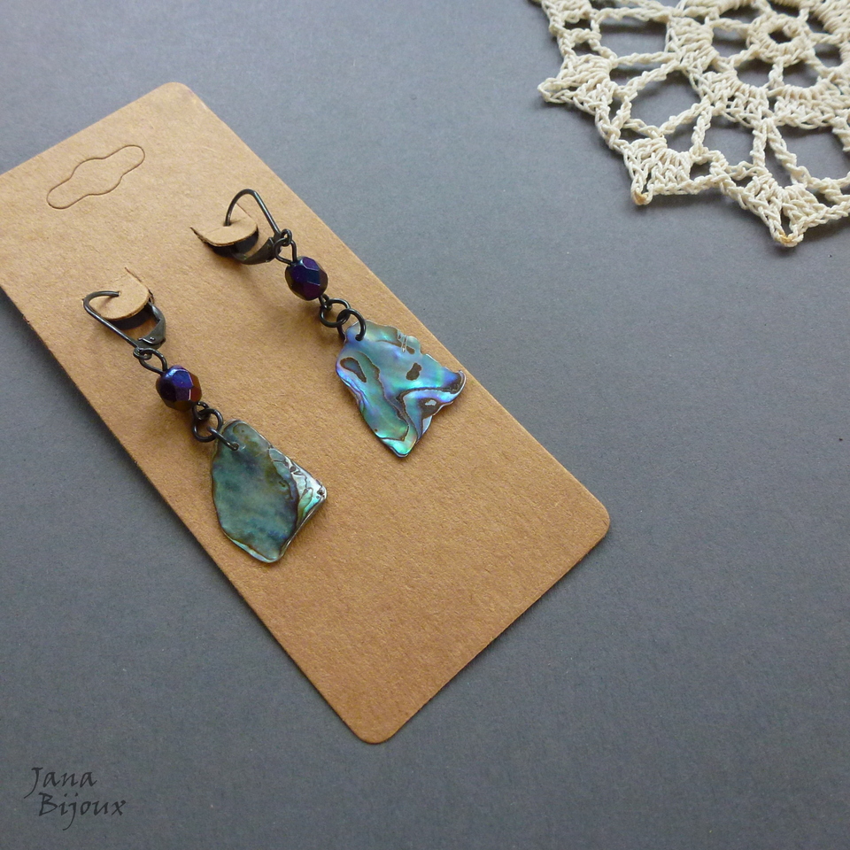 z128 03/10/2017VENDIDOS ( Prodáno)Jana Bijoux Brincos de zinco preto de comprimento 4,8 cm com vidro e lascas irregulares de abalone. Super leves e únicas R$ 19,90