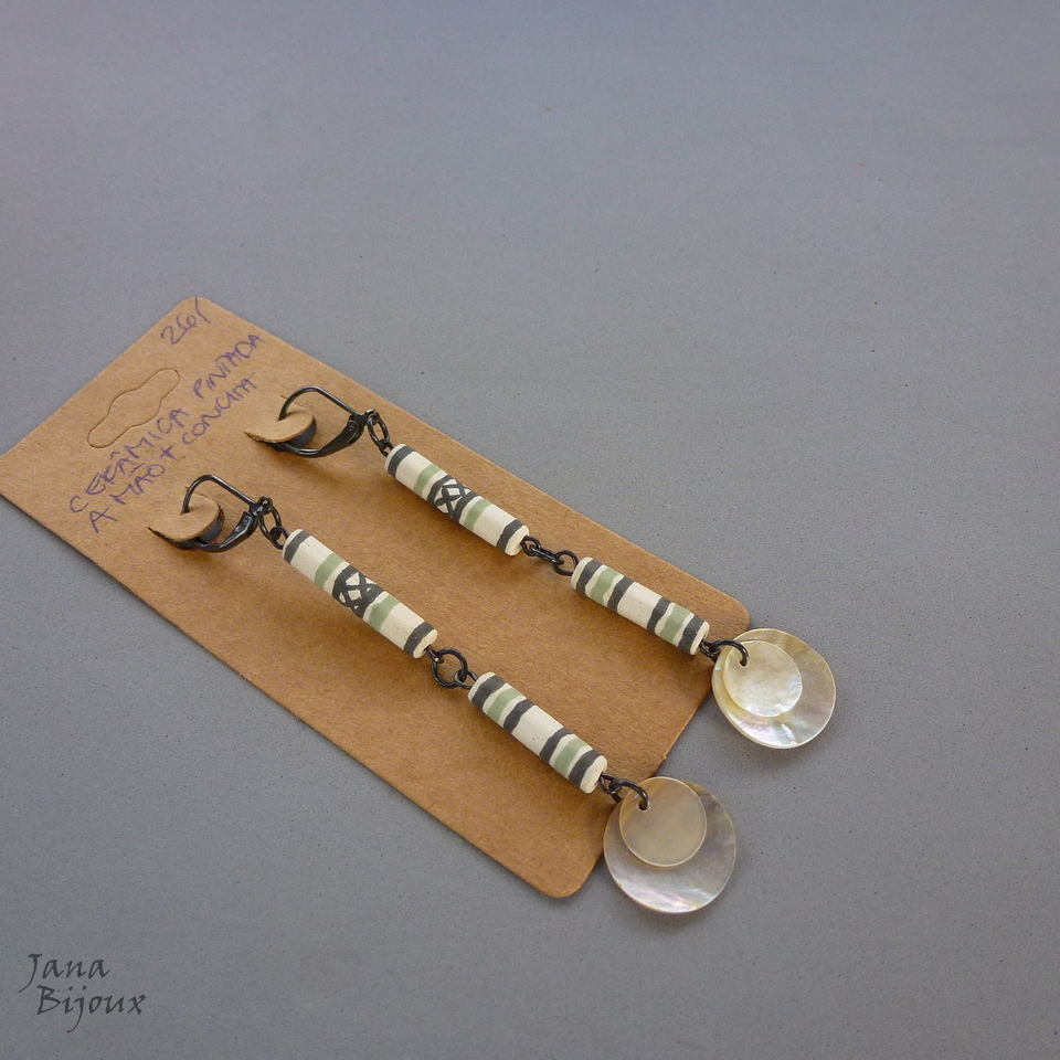 z145 09/05/2018VENDIDOS ( Prodáno)Jana Bijoux 9 cm, super leves, brincos com cerâmica pintada a mão e 2 tamanhos de conchas naturais, para brilho metálico R$ 26,00