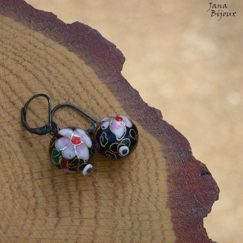 Brincos com fecho preto de 3,5 cm comprimento. Com grandes bolas de cloisonné pretas R$ 26,00
