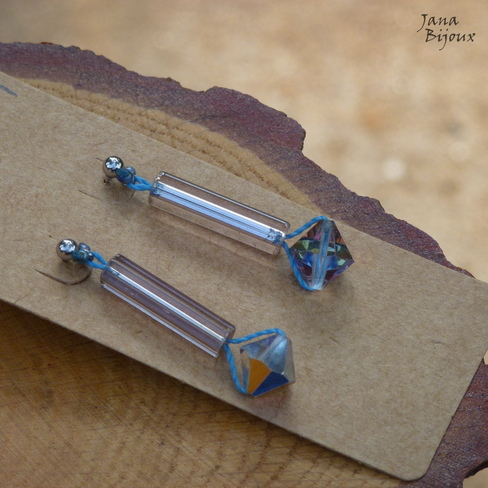 Brincos diferentes com fecho de tarracha de aço inox, fio azul e vidro prata e cristal. Possível com fio de outra cor da sua preferencia.. Comprimento 4,7 cm R$ 13,00