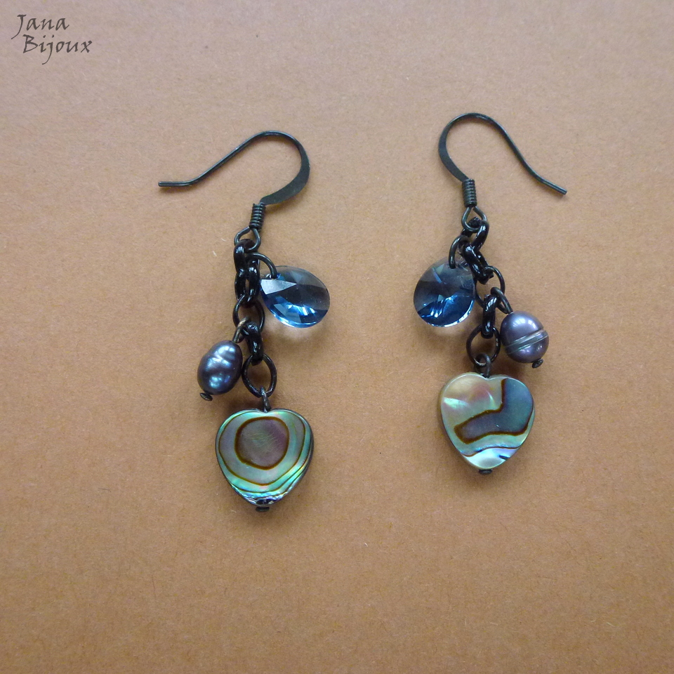 Brincos delicados,  chiques, pretos, compridos 5 cm com abalone, pérolas naturais escuras e 2 gotas de cristal Swarovski azuis. R$ 26,00