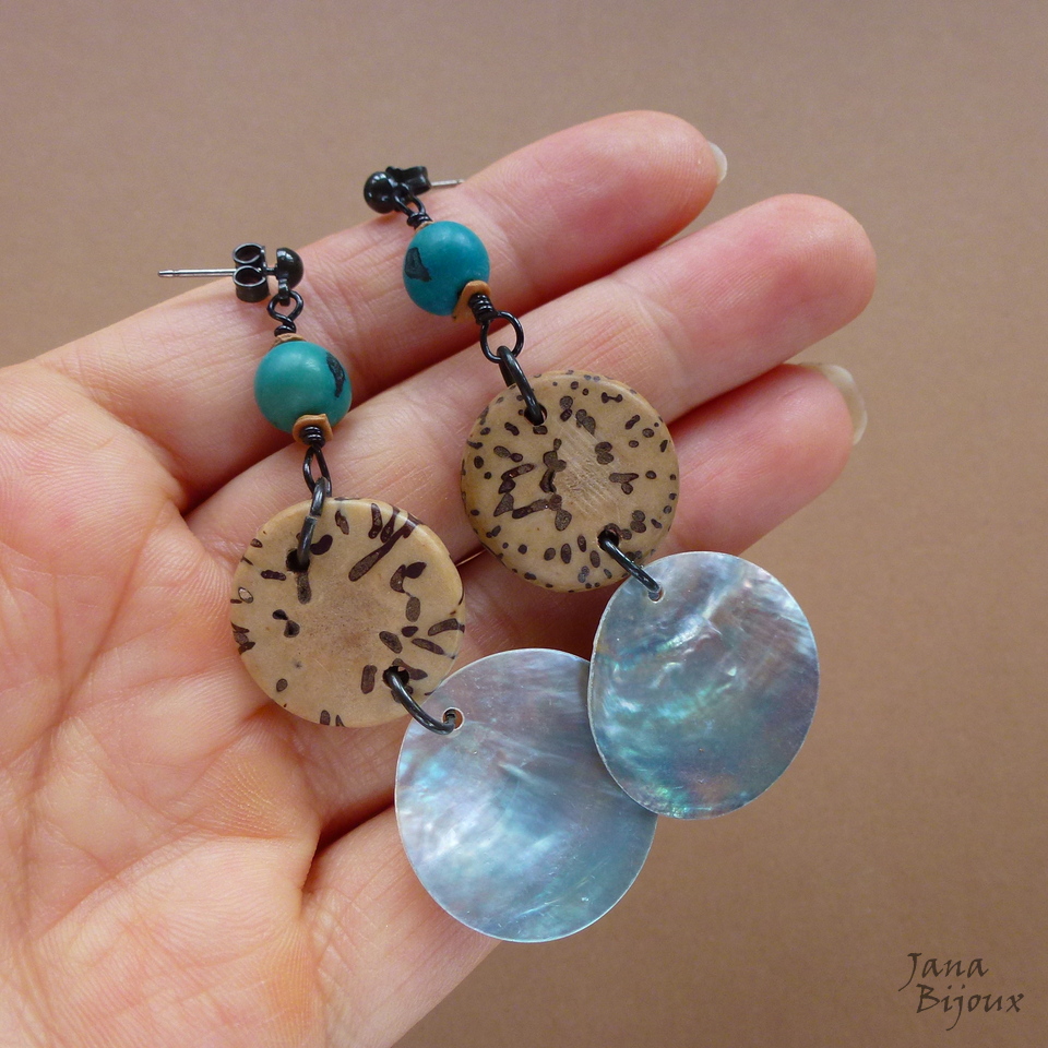 z79 05/09/2015VENDIDOS ( Prodáno)Jana Bijoux Brincão de 7,5 cm, leves, com fecho preto de titânio, arame torcido, sementes e conchas grandes R$ 16,00