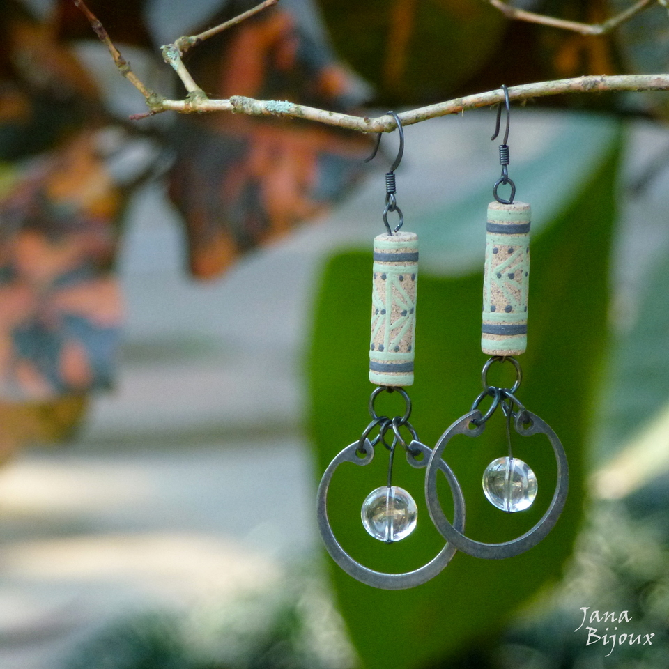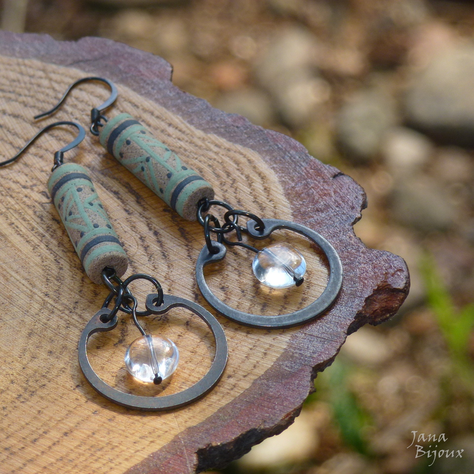 Cerâmica da Janete e anéis recicladas, comprimento 8,3 cm e quartzo – pedras naturais. R$ 36,00