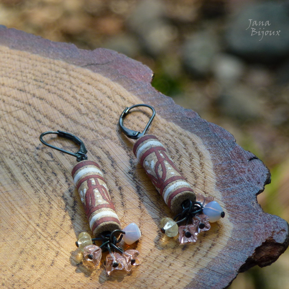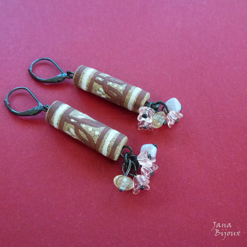 Brincos compridos 5,8 cm de cerâmica, desenhados a mão como toda cerâmica que uso, pela grande Janete Dallabona e com vidros. Leves e com componentes pretos. R$ 25,00