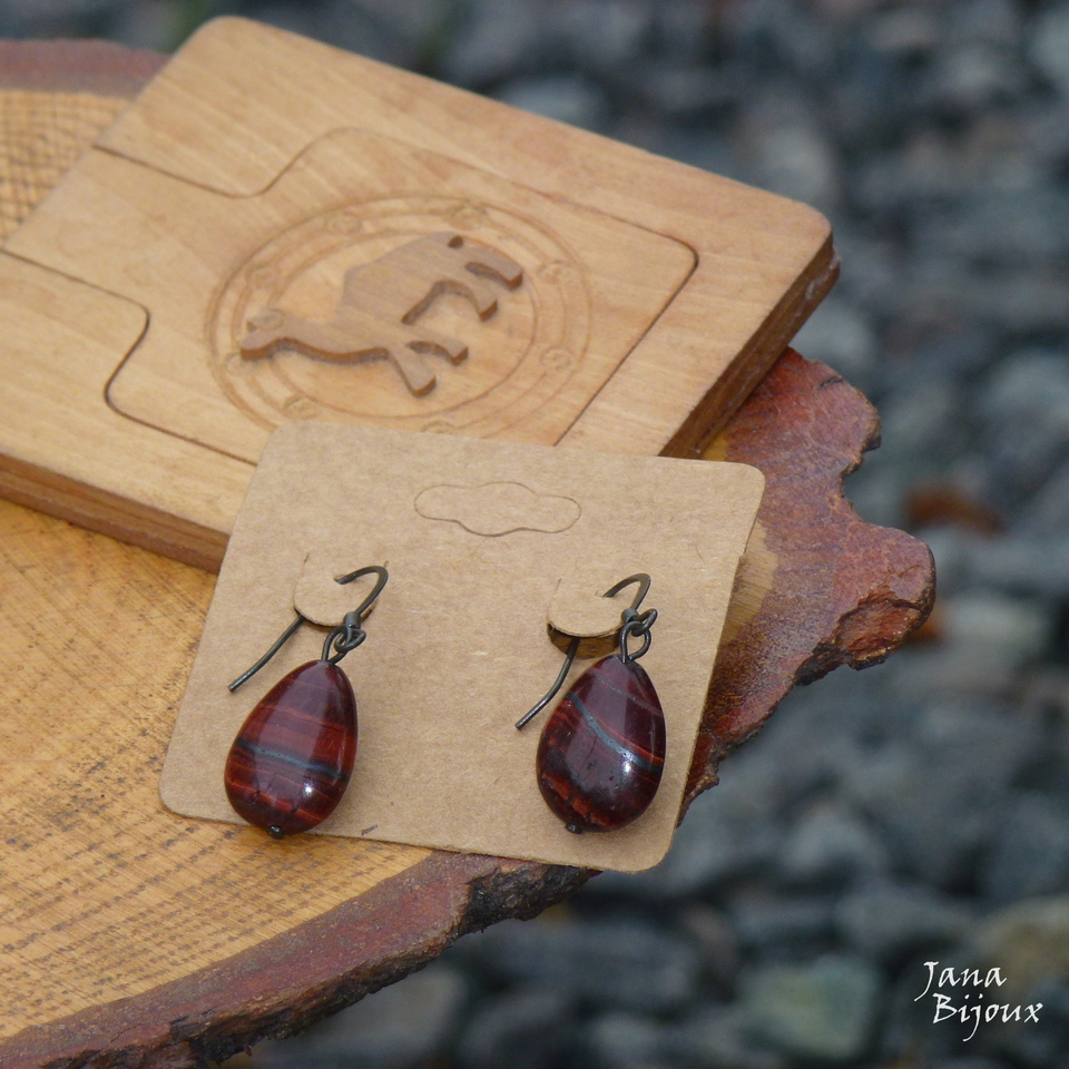 Brincos compridos 3,5 com gotas de pedras naturais de olho-de-boi, fecho de anzol em zinco preto R$ 18,00