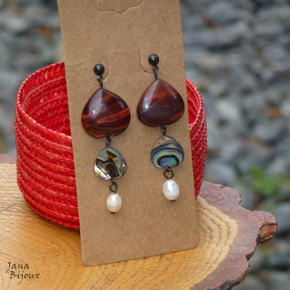 z98 19/09/2016VENDIDOS ( Prodáno)Jana Bijoux Brincos compridosde 5,5 cm com tarrachas de titânio cor preta, pedras naturais de olho-de-boi, abalones e pérolas de àgua doce R$ 32,00